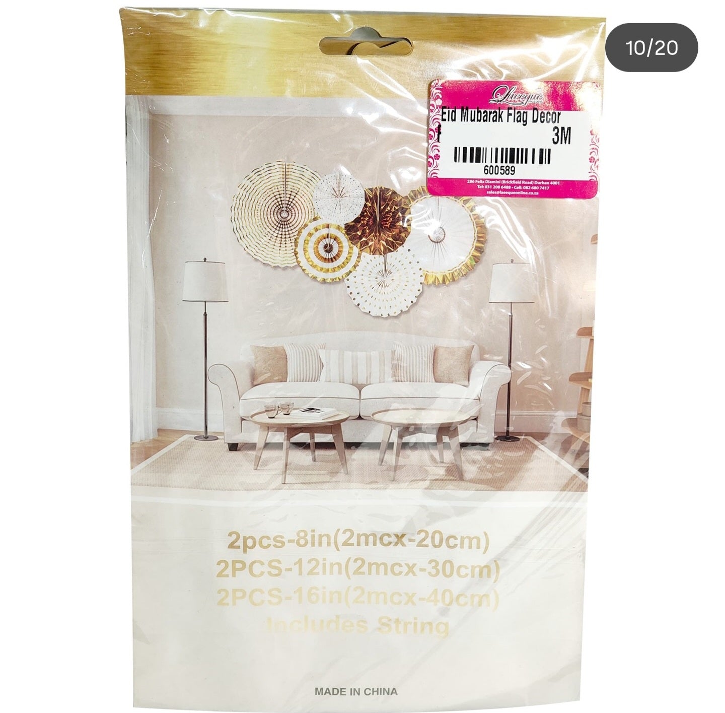 The Days of Eid Garland pack is a collection of décor including a bronze & crème color paper fan set, gold & crème color tassel garland, and two white glitter moon & star garlands. All of these décor items match our burlap banners perfectly and can even be used for other holidays. Use this set as a background for our Burlap banners to set the scene around your fireplace or decorate a pretty dessert table for your guests.